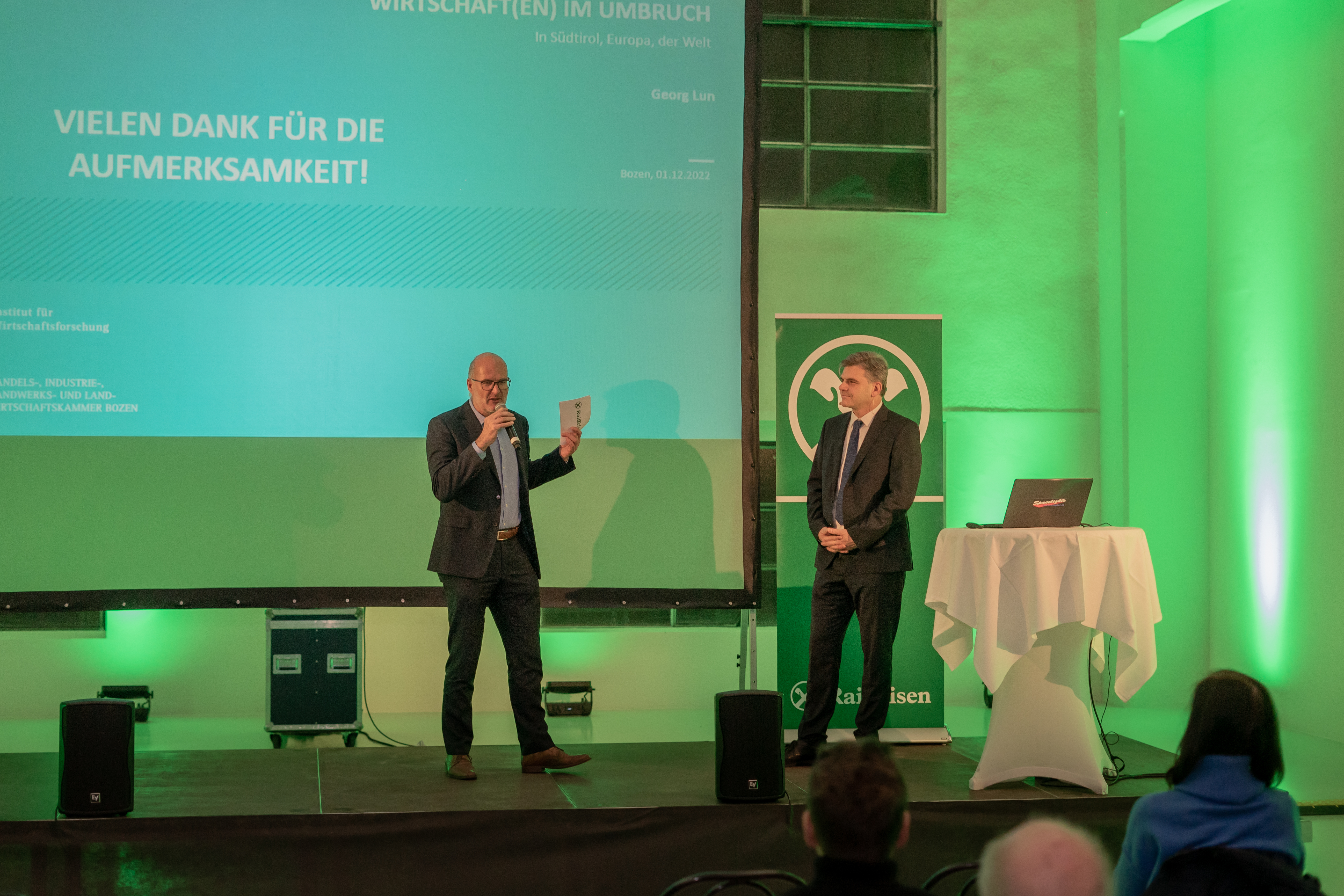 L’attuale situazione economica è segnata da turbolenze, crisi e profondi cambiamenti. In occasione di un evento organizzato da Raiffeisen InvestmentClub, il 1° dicembre presso il NOI Techpark di Bolzano, alla presenza di circa 180 soci, Georg Lun, direttore dell’IRE presso la Camera di commercio di Bolzano, ha parlato delle conseguenze per l’Alto Adige e perché tutto ciò può rivelarsi un importante stimolo per l’innovazione.
